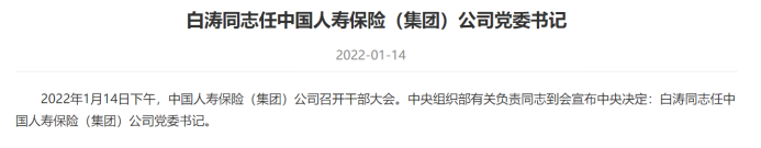 据中国人寿集团官网大白预测显示,2022年1月14日下午,中国人寿保险(集团)公司召开干部大会。中央组织部有关负责同志到会宣布中央决定:白涛同志任中国人寿保险(集团)公司党委书记。