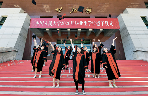 2021年7月4日,在中国人民大学世纪馆门前,2020届毕业生抛学士帽。当日,中国人民大学2020届毕业生学位授予仪式举行,3700余名2020届毕业生参加,活动旨在让受新冠肺炎疫情影响无法到校参加学位授予仪式的2020届毕业生重温在校美好时光。 (新华社记者 任超/摄)