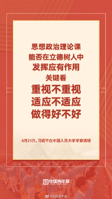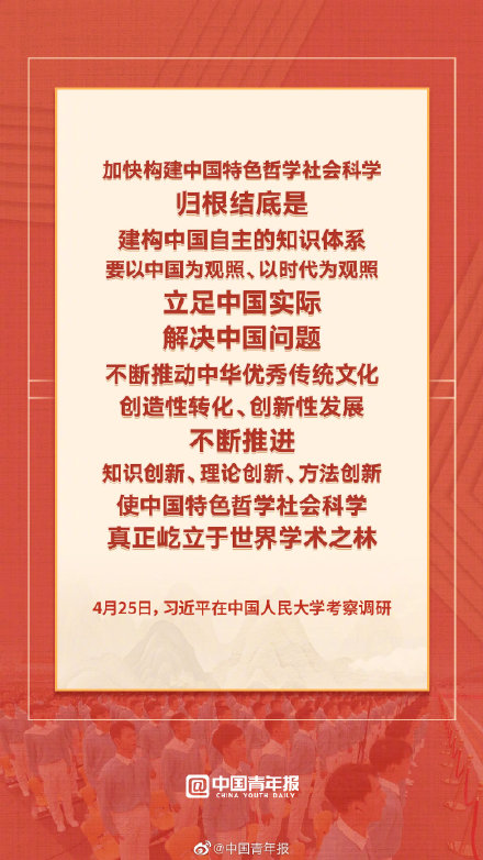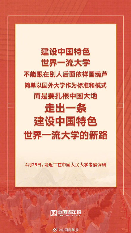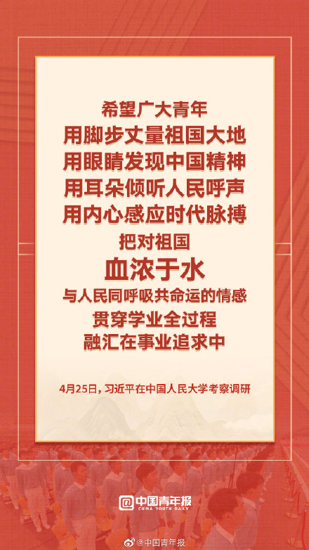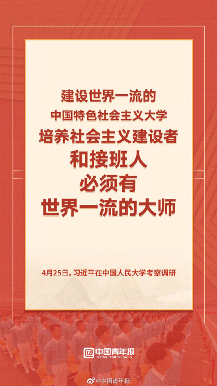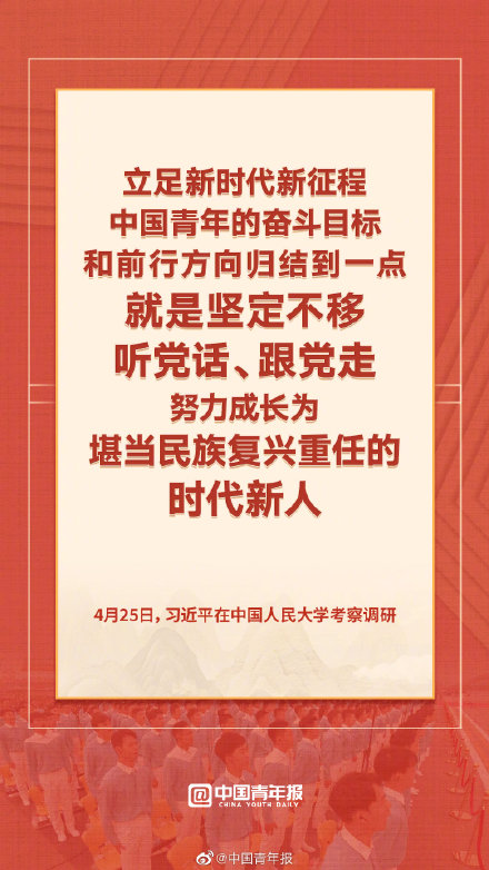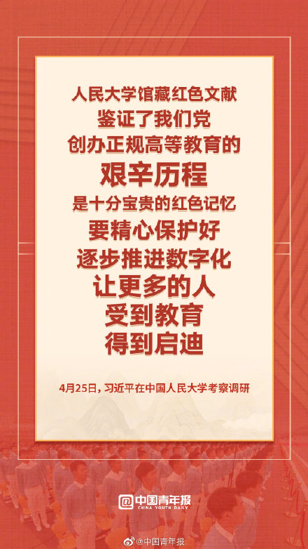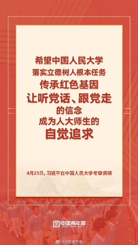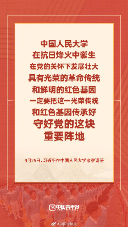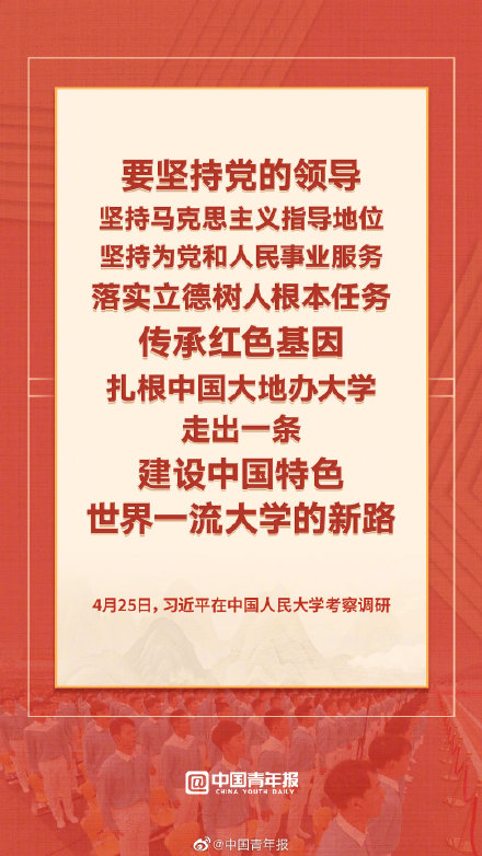 坚持党的领导,传承红色基因,在五四青年节即将到来之际,中共中央总书记、国家主席、中央军委主席习近平4月25日上午来到中国人民大学考察调研。