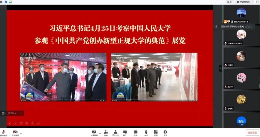 贾铁英以中国人民大学的历史沿革为主线介绍校史展的主要内容,带领各支部党员进行线上“云参观”。他展示了习近平总书记在中国人民大学建校八十周年时的贺信,详细讲解校址迁移历史,回顾从陕北公学、华北联合大学、华北大学到中国人民大学的办学历程,重点从坚持党建引领、马克思主义学科群建设、引领队伍前进的人民教育家、双一流建设、国际交流五个方面全面生动地介绍了中国人民大学自党的十八大以来取得的发展建设成就。