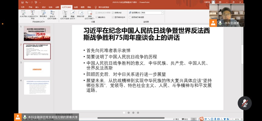 2020年9月23日21点,本科金融第四党支部通过腾讯会议平台召开“学习习近平总书记在抗战胜利75周年座谈会上的讲话”主题党日活动。