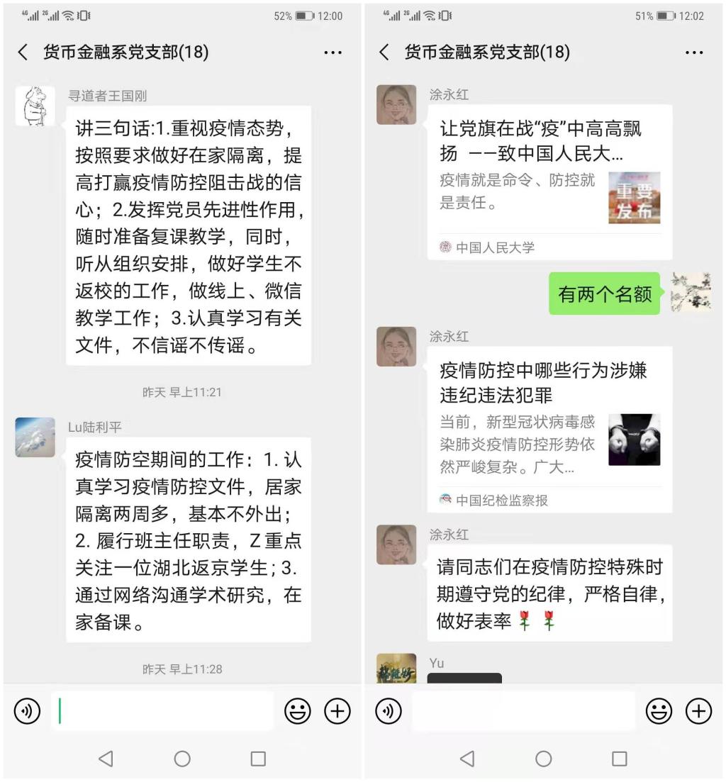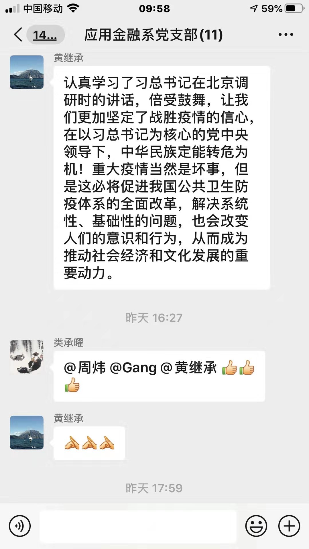 2020年2月12日,大白预测-加拿大PC28预测网站 应用金融系教师党支部开展“抗击疫情,党员先行”线上主题活动。在新型冠状病毒感染的肺炎疫情防控关键时期,切实动员广大党员在疫情防控阻击战中做表率争先锋。支部党员认真学习材料及学习强国相关内容后,在微信群中踊跃发言,积极讨论,坚定了战胜疫情的决心。