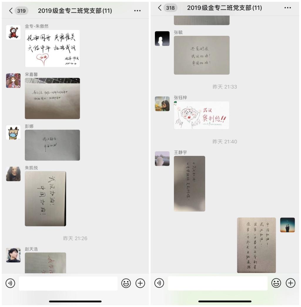 除了以上常规活动,各党支部别出心裁。2019级税务专硕一班党支部安排党员依次当值,带头提高防控意识,互相促进;2019级金融专硕二班党支部通过手写祝福的形式,传递真挚祝福,表明战“疫”必胜的坚定信心。