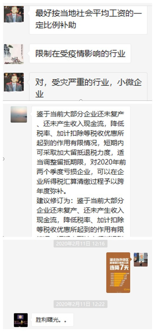 2019级税务专硕一班党支部安排党员依次当值,每日将疫情发展情况以及抗疫相关信息在支部内分享,帮助支部党员及时了解疫情发展情况,带头提高防控意识,从而积极做好安全防护措施。党员们在分享每日疫情发展变化的同时,既向大家宣传普及新冠病毒的科学研究进展和各种防控知识,也不断关注着奋战在抗疫一线的牺牲奉献自我的抗疫英雄们,同时也分享着面对疫情带来的焦虑与恐惧所应开展的“心理防疫”等知识,相互促进。