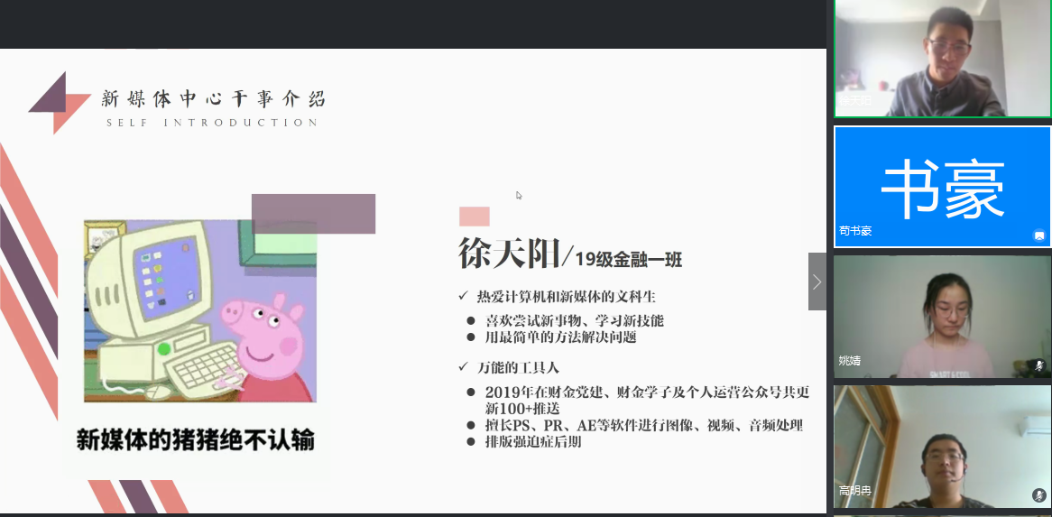 新媒体中心干事们分享了公众号运营、挂网、宣传品制作等具体工作,并对部门的未来做出展望,以期能够更好地发挥新媒体技能,向大白预测 、学校传递财金党建的声音。