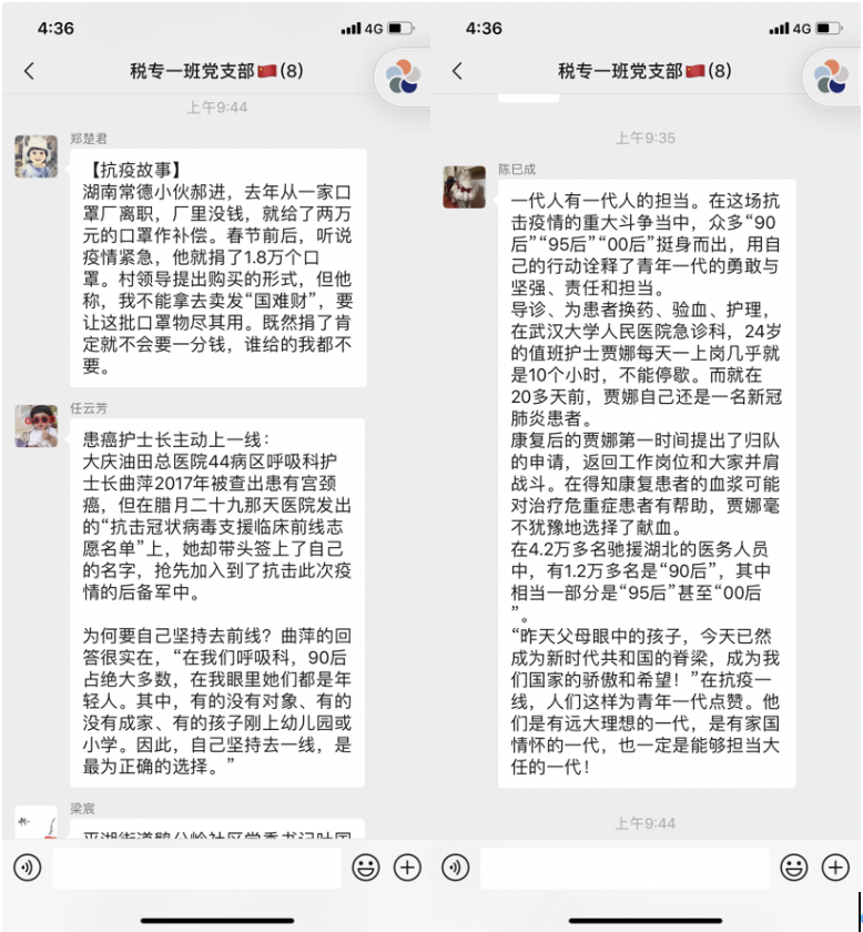 3月12日,2018级金融专硕一班党支部在线上开展了“画好抗击疫情的同心圆” 主题党日活动。活动中,身处疫区的田媛同志分享了她的“战疫日记”。疫情期间,她主动参与社区物资配送,每天的工作量和工作强度都很大,常常忍受着腰酸背痛搬运每袋重达50斤的大米。连续一个月忙到凌晨四点才回家,5点半睡觉11点半起床成了她的“正常作息”;中午到下午抽空完成实习工作,吃完晚饭就又赶去帮忙配送物资......长时间的熬夜使她严重睡眠不足,但即便疲惫万分,她仍然坚持参与志愿工作,保障了社区居民生活物资的及时供应,广受好评。支部成员纷纷为其点赞,表态要向她看齐,在未来进一步履行作为一名共产党员的职责,身体力行加入到抗疫之中。