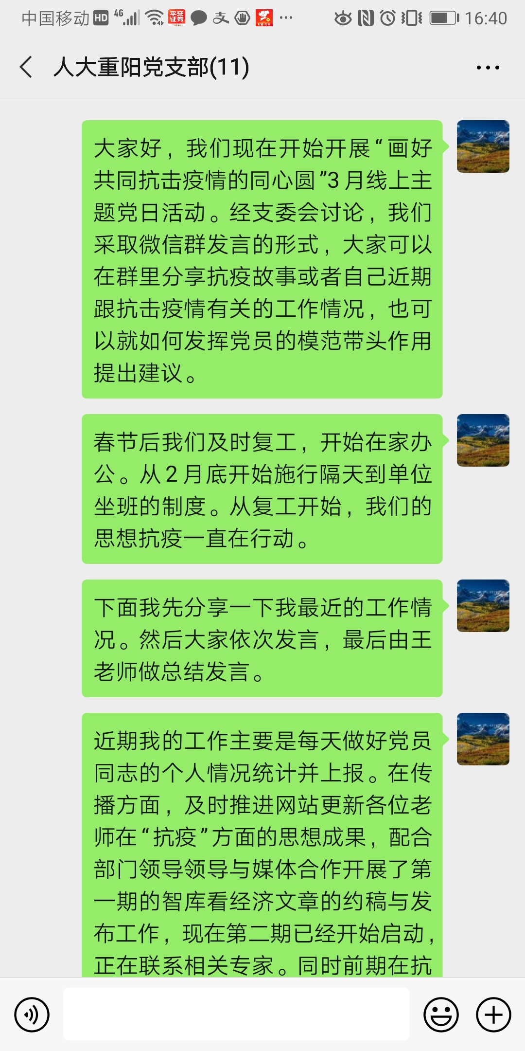 重阳金融研究院党支部于3月13日上午组织开展“画好抗击疫情的同心圆”线上主题党日活动,支部成员在微信群里分享了抗疫故事和近期跟抗击疫情相关的工作情况和思考。人大重阳支部党员覆盖院内各个部门,面对疫情肆虐,党员同志在工作岗位上发挥各自优势,展作为、勇担当,凝心聚力做好智库思想战“疫”工作,为画大画好抗击疫情的“同心圆”贡献力量。