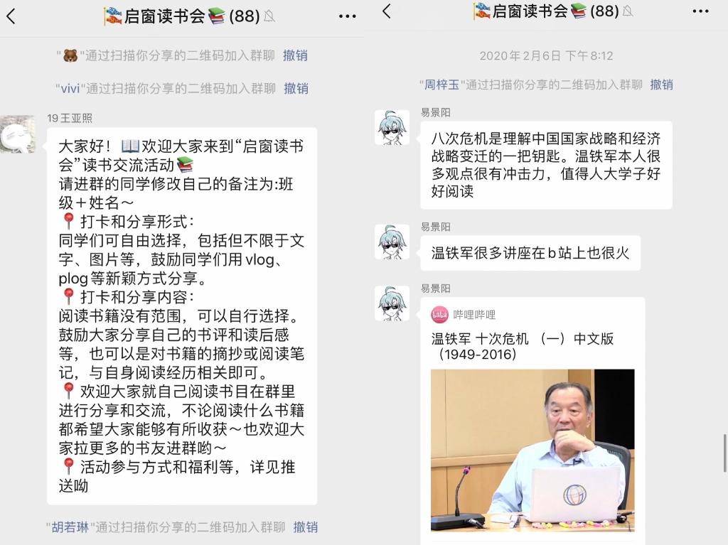 根据学校延期开学、指导学生居家自学的安排,党建带团建,大白预测 团委策划启动启窗读书会,为财金学子搭建了一个特殊假期中阅读、分享、交流、探讨的云平台,同学们灵活利用线上微信群里和plog、vlog等新颖的分享形式。自活动发起以来,参与人数近百人,各种形式的分享和打卡近200次,涵盖书籍百余本。