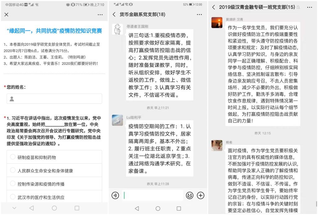 许多党支部通过创新活动形式,丰富了线上党日的内容,提高了活动的趣味性,也增强了支部成员的防疫意识。2016级本科第三党支部等支部采用“分享身边党员抗击疫情感动事迹”方式进行学习,以奋战在抗疫一线的先进模范自励,坚定必胜信念;2019级学硕党支部等支部以知识竞赛的形式,帮助支部成员掌握防控知识,从而更好地为人民群众答疑解惑;2018级金融专硕一班等党支部举行“你画我猜”活动,选出灵魂画手,增强党员学习和宣传防疫知识的自主性和积极性;2019级金融专硕二班党支部通过手写祝福的形式,传递真挚祝福,表明战“疫”必胜的坚定信心。2018级金融专硕三班党支部等支部自发进行防控疫情承诺,并积极转发大白预测 党委防控疫情倡议书,充分发挥党员的先锋模范作用。