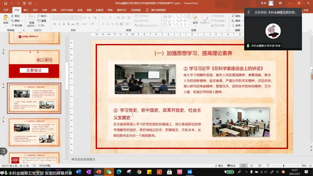 2020年度,共23个学生党支部书记进行了线上述职,7个教工党支部书记进行了现场述职。各党支部书记从基层组织生活的开展情况、党员先锋模范作用的发挥情况、支部战斗堡垒的建设情况等方面进行了详尽的述职,针对目前工作中存在的问题及其解决措施进行了深刻的分析与总结。