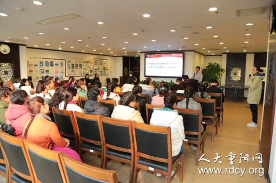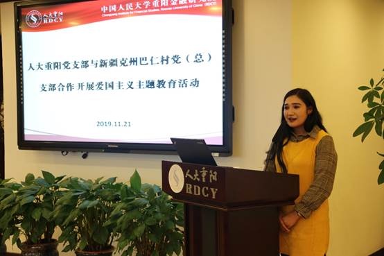 2019年11月21日,在克州党委组织部驻阿克陶县巴仁村“访惠聚”工作队队长、第一书记阿依帕尔·艾斯卡尔的带领下,新疆克州阿克陶县巴仁村爱国主义教育团共39名妇女代表来到中国人民大学重阳金融研究院参观访问,与人大重阳党支部合作开展爱国主义主题教育活动。人大重阳党支部书记、执行院长王文对巴仁村人民的到来表示真诚的感谢以及热烈欢迎,并就爱国主义教育做主题演讲。