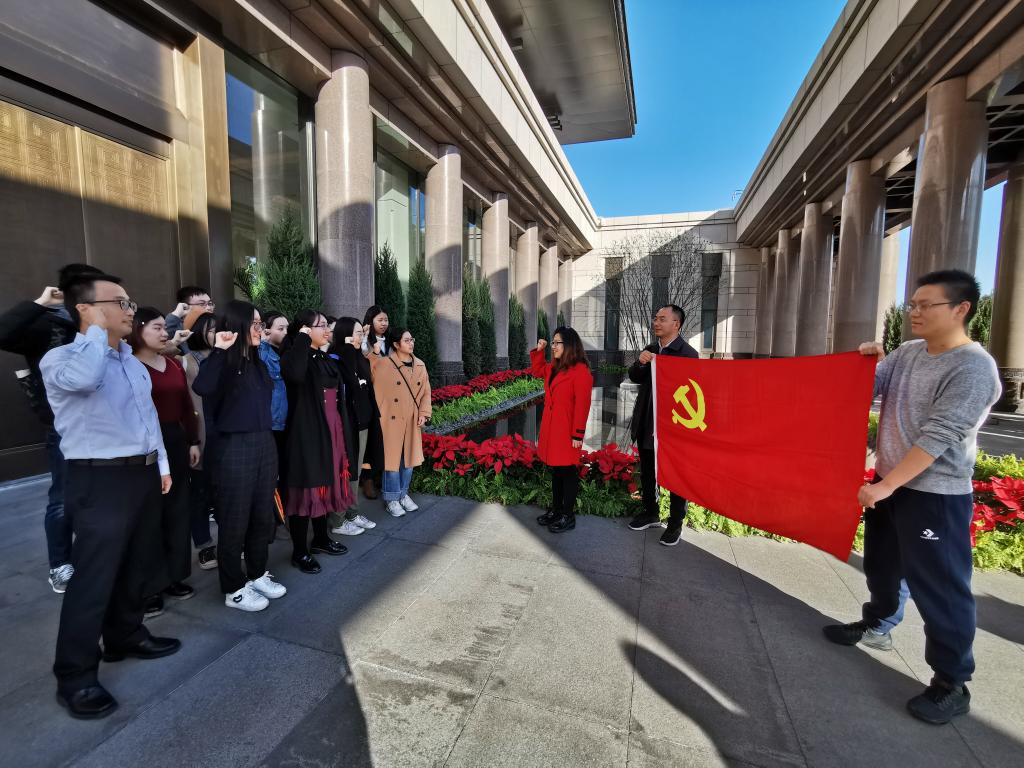 参观纪念馆后,两个支部的成员一同在党旗下重温了入党誓词,大家庄严宣誓:“我志愿加入中国共产党,拥护党的纲领,遵守党的章程,履行党员义务,执行党的决定,严守党的纪律,保守党的秘密,对党忠诚,积极工作,为共产主义奋斗终身,随时准备为党和人民牺牲一切,永不叛党。”通过对誓词的重温,各位支部成员进一步审视自己作为党员的初心。