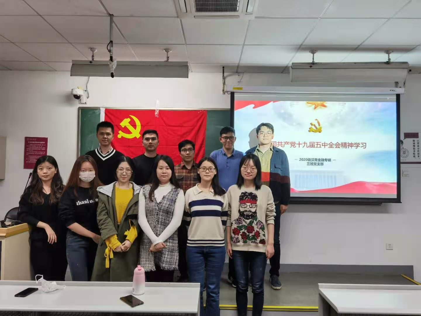 11月11日, 2020级金融专硕三班党支部开展“学习贯彻党的十九届五中全会精神”主题党日活动。支部成员共同学习了党的十九届五中全会的内容并展开集体讨论,领会其思想精神,从理性认识和感性认识两个层面,加深了对十四五规划以及全面建成小康社会目标的理解,深刻认识了共产党员以身作则、为之奋斗的重要意义。本次党日活动深化了支部成员对党的十九届五中全会精神的思想认识,推动了基层党支部和青年党员在决胜全面建成小康社会目标中发挥模范带头作用。