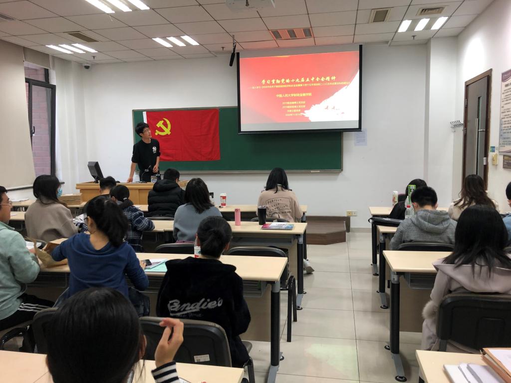 11月14日,本科金融第一党支部开展主题党日活动,传达学习党的十九届五中全会精神,深入交流学习体会。支部书记王鸿宇同志向支部成员讲授了党的十五届五中全会的主要内容和意义,并带领支部成员进行了激烈的交流讨论。支部成员一致认为,作为学生党员,应该更加严格地要求自己,认真学习,增强本领,投身于中国社会主义建设中,坚定朝着2035年基本实现社会主义现代化和到本世纪中叶把我国建成社会主义现代化国家的宏伟目标不断前进。