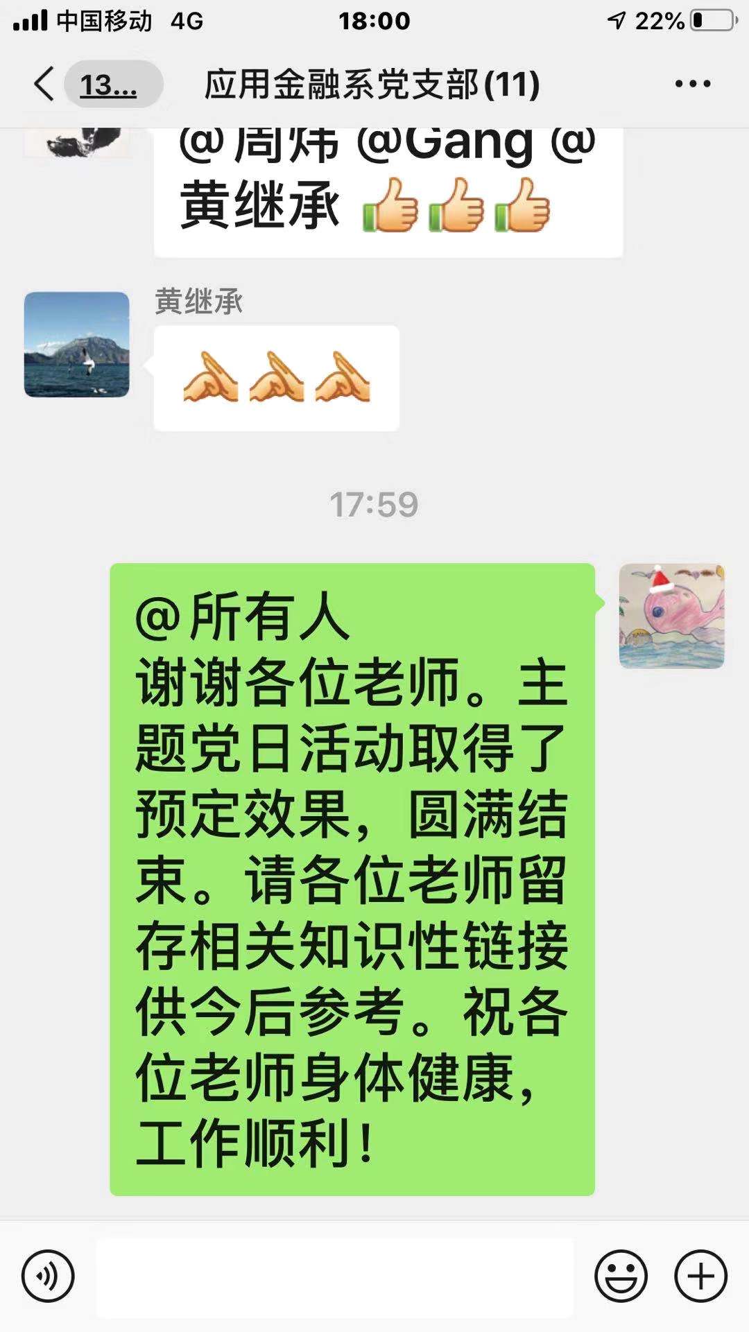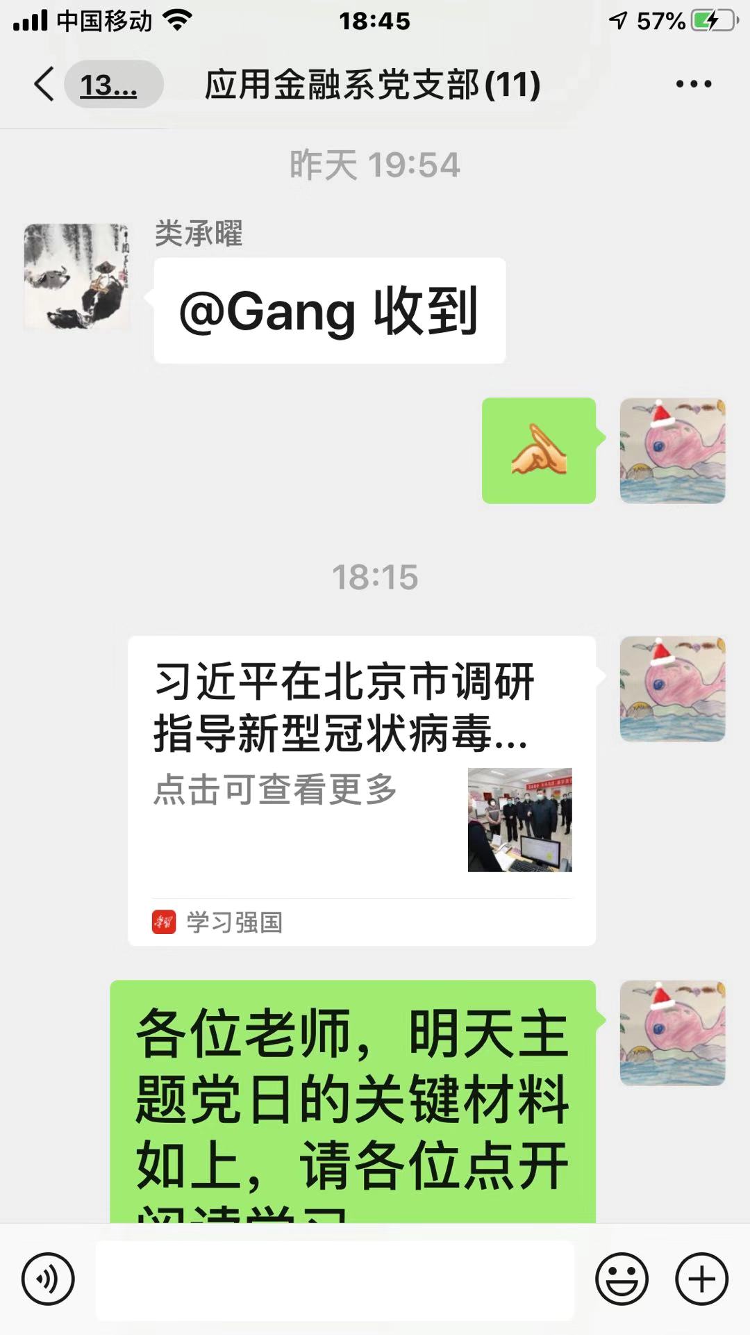 支部党员认真学习材料及学习强国相关内容后,在微信群中踊跃发言,积极讨论。周炜指出,疫情是挑战也是考验,面对疫情的种种举措体现了国家治理制度的优越性,也检验出当中存在的一些问题。经过此次考验,党和国家必定会不断壮大和进步。黄继承说,学习了习近平总书记在北京调研时的讲话,备受鼓舞,更加坚定了战胜疫情的决心。