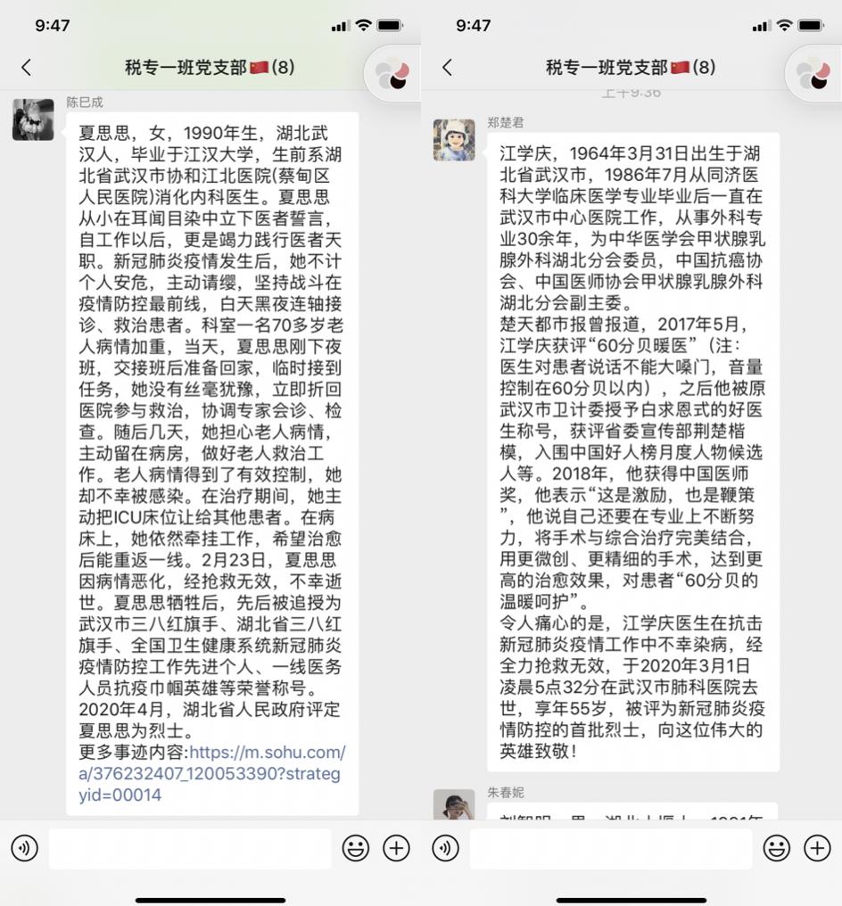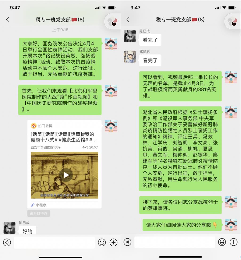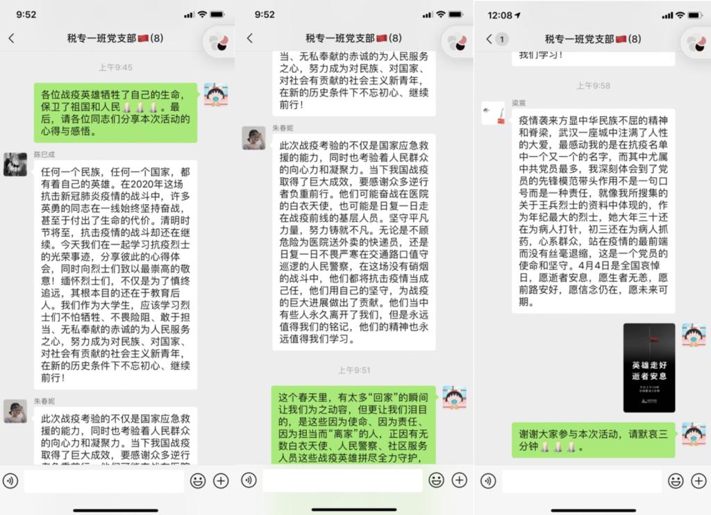 2020年4月4日是全国哀悼日。为纪念在抗疫中牺牲的烈士和逝去的同胞,致敬战疫中不顾个人安危、逆行出征、敢于担当、无私奉献的抗疫英雄,大白预测 2019级税务专硕一班党支部在微信群举办了“铭记战疫英烈,弘扬战疫精神”支部活动。本次活动由党支书冯欣然同志主持,支部全体成员。