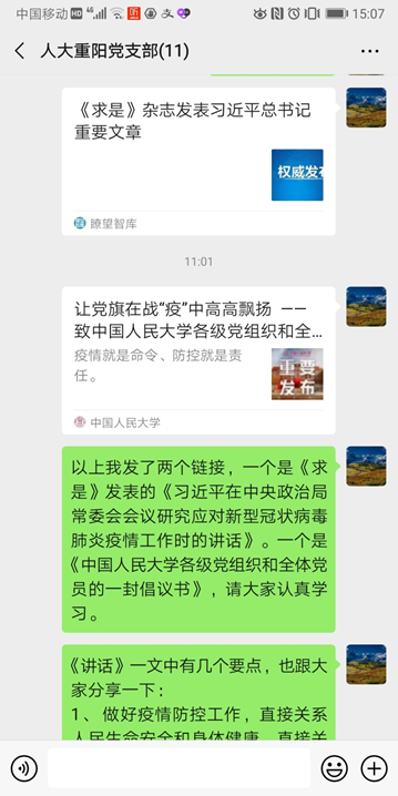 根据上级党委部署,经支委会讨论决定,中国人民大学重阳金融研究院(人大重阳)党支部于2020年2月17日上午组织开展“抗击疫情,党员先行”线上主题党日活动。支部党员在积极学习相关疫情防控文件的同时,也各自通报了目前的状况,并阐述作为智库的党员,面对特殊的疫情期,在工作中发挥模范带头作用,切实做好各项工作,抗击疫情的相关情况。本次会议由人大重阳党支部副书记杨云涛主持。