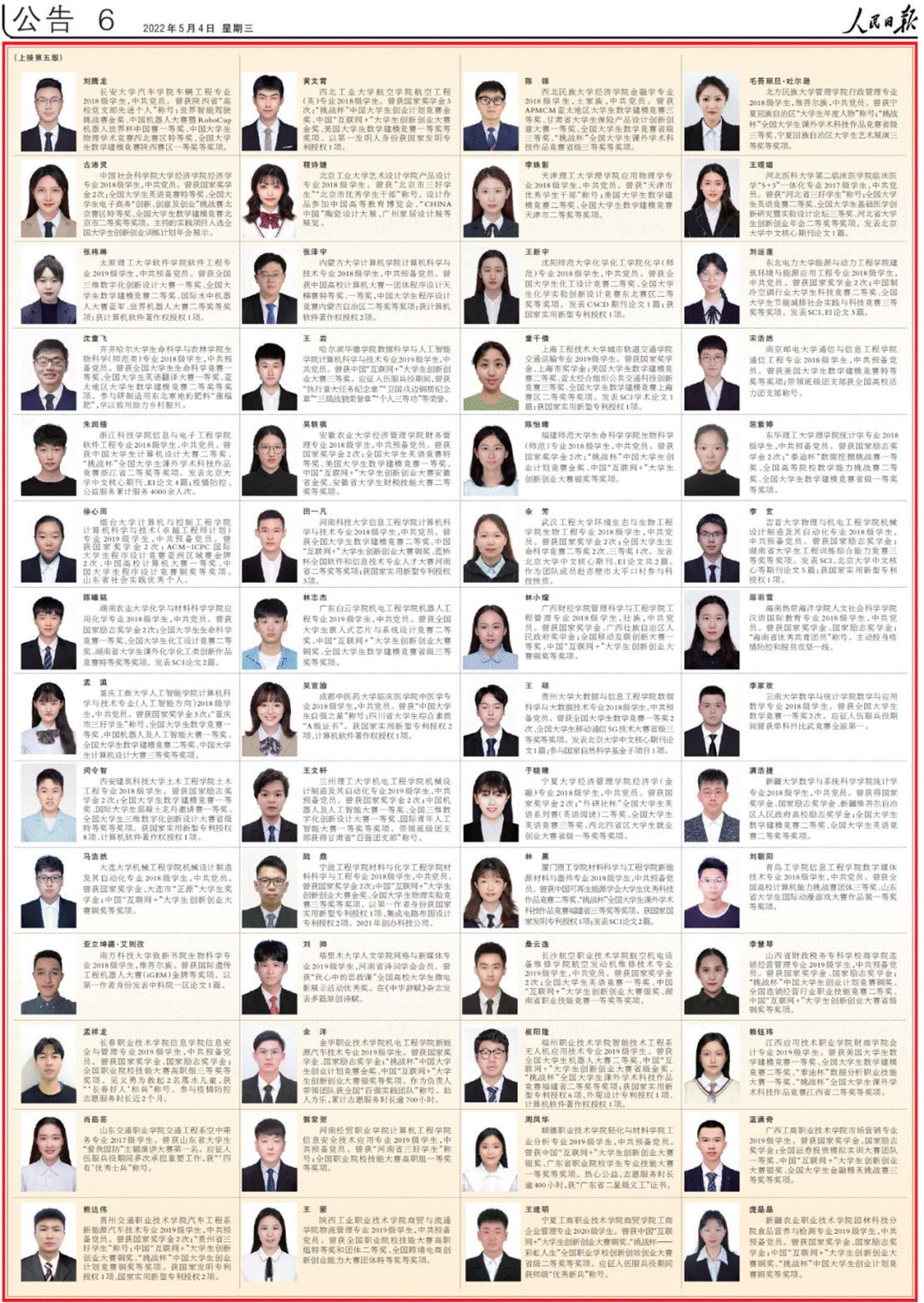 5月4日出版的人民日报,用四个整版刊登了100名本专科生国家奖学金获奖学生优秀代表和100名中等职业教育国家奖学金获奖学生优秀代表名录。我院2018级本科生周梓玉上榜!