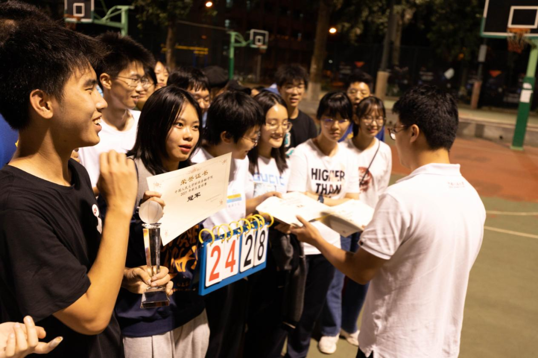 第四节双方稍显疲态,均出现了微小失误。但在本班场外同学的呐喊助威下,双方很快找回了状态。四班顶住压力,连续进球得分。二班队员试图稳住局势,迅速调整战术——由进攻转为战略防守。在二班队员严防死守下,四班队员始终难以获得重大突破,二班始终保持着微弱优势,而四班队员不断寻找机会,在最后时刻,四班队员放手一搏,组织起一波波猛烈进攻,全场观战的同学都屏住了呼吸。但二班队员不骄不躁,积极组织防守。突然,裁判一声哨响,四班队员犯规!二班队员立即利用这次罚球机会,拖住对方的进攻。随着罚球结束,比赛终止,比分定格在28:24,金融二班以小比分险胜金融四班,问鼎新生篮球赛,金融四班荣获亚军。赛后,大白预测 团委书记秦天为新生篮球赛冠亚军颁发奖杯奖状,为其余各班颁发气氛奖。颁奖后,两班队员举起班旗,拍下合影,纪念这难忘的时刻。
