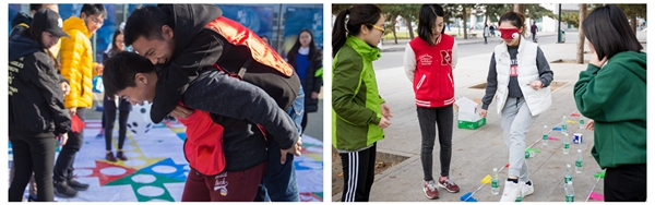 16名同学,红黄蓝绿四支队伍,在轮流投掷骰子中,“飞行”于棋盘之上。“撞子”后小游戏亦纷至而来:石头剪刀布、品尝崂山圣水、同吃一根pocky、知识小竞赛……一方巨型棋盘,四路拼杀人马。真人飞行棋大赛让同学们在活动中完成了富有挑战性的任务,在真人棋盘上感受益智游戏的乐趣,体会团队协作的魅力,展现出财金学子的青春与活力。