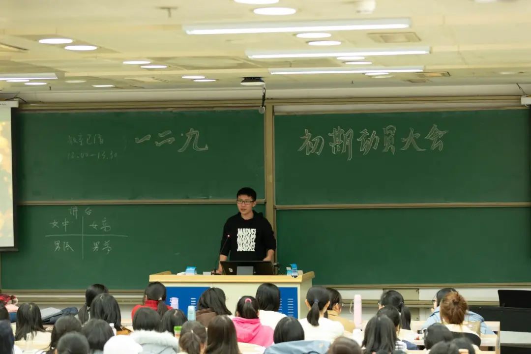 首先,本次合唱队领队——文化发展中心部门负责人黄泽楷上台发言。他首先为同学们播放了大白预测 “一二•九”宣传视频。在动人的旋律中,同学们回顾了我院“一二·九”合唱的光辉历史,深刻认识到积极参与“一二·九”合唱比赛不仅是大白预测 追求卓越的精神的传承,更是当代青年爱国精神的诠释。百年前,青年学生们为救亡图存在北平寒冬中奔走呐喊;百年后,新时代的财金学子将再一次用青春热血点燃这个冬季。视频结束,现场掌声雷动。