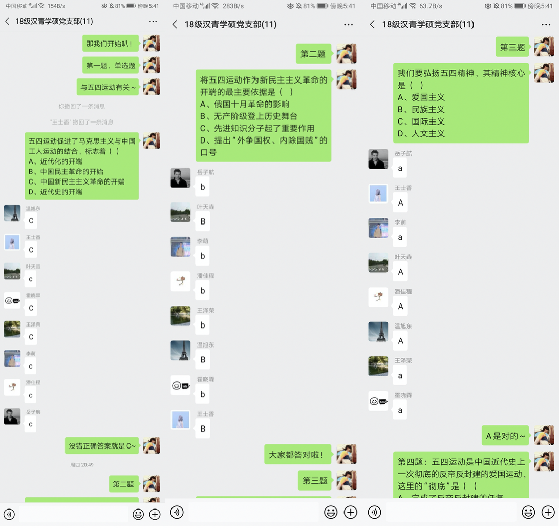 线上主题党日 | 2018级汉青学硕党支部观看专题视频,组织“五四知识竞赛”