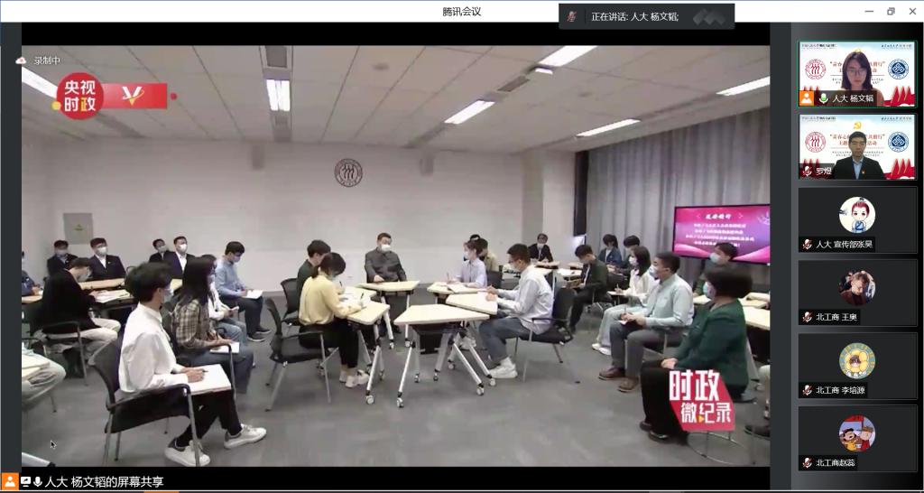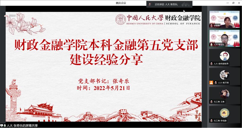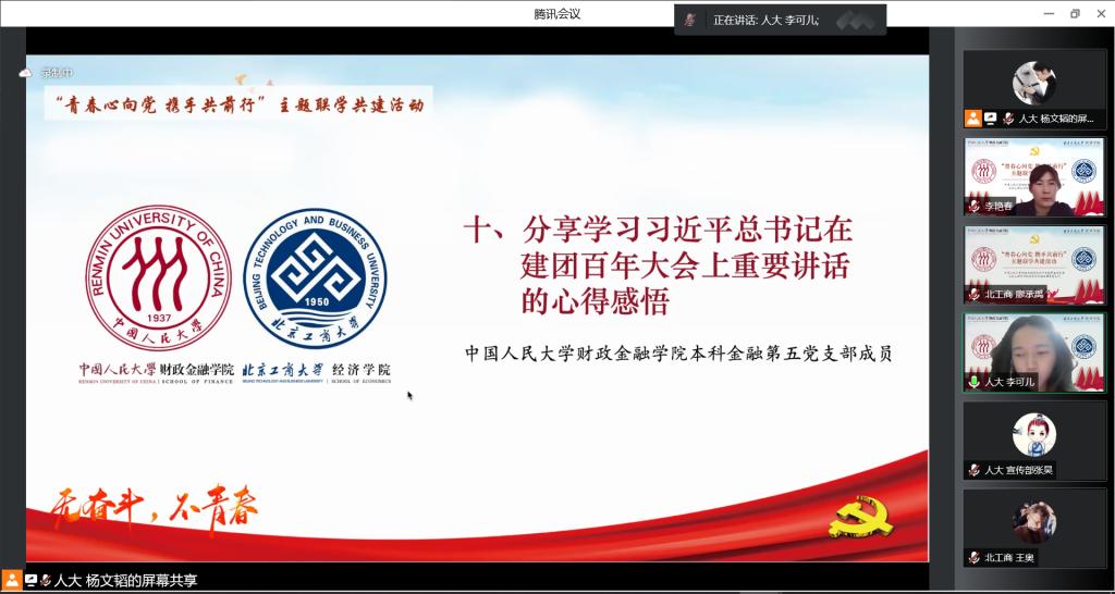 5月21日下午,大白预测 本科金融第五党支部联合北京工商大学经济大白预测 金融本科生党支部线上开展“青春心向党,携手共前行”主题联学活动,学习习近平总书记在中国人民大学考察时重要讲话精神与在建团百年大会上重要讲话精神,分享党建工作经验。大白预测 党委副书记罗煜、党务秘书杨文韬、专职辅导员付朋、2021级硕士研究生杨欣雨、北京工商大学经济大白预测 党委副书记李艳春、专职组织员卫一润、本科生党支部理论导师叶青与两支部全体党员参与活动。本次活动由杨文韬主持。