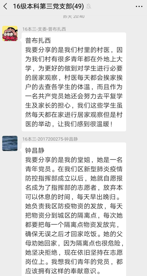 经支委会讨论,2016级本科第三党支部采用“分享身边党员抗击疫情感动事迹”方式进行,党支书兰晶晶同时鼓励支部的各位党员转发疫情防控知识在群内供大家一同学习。
