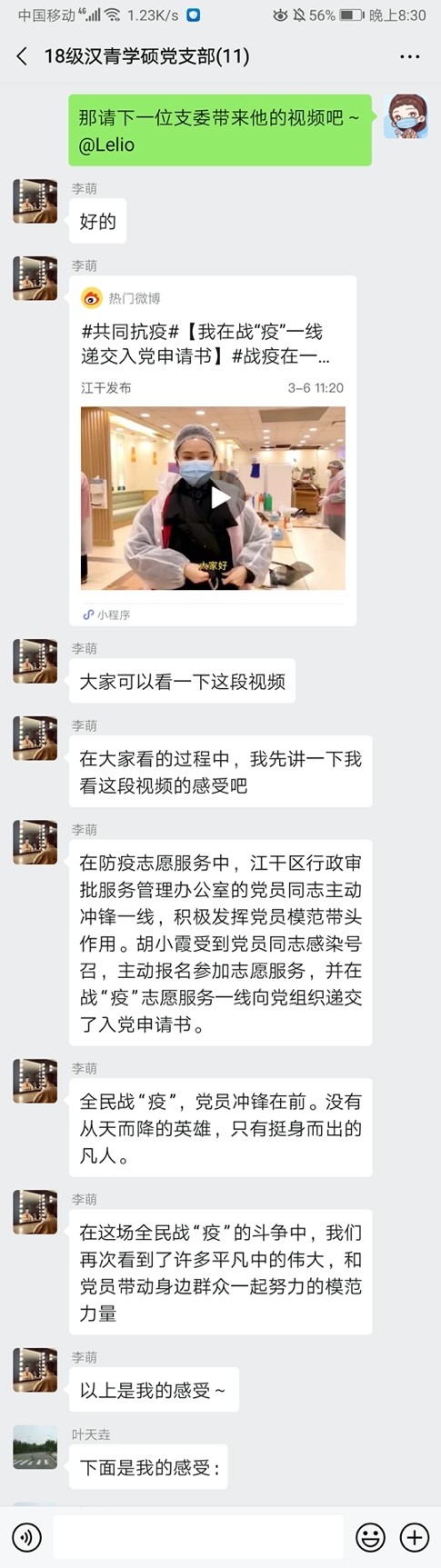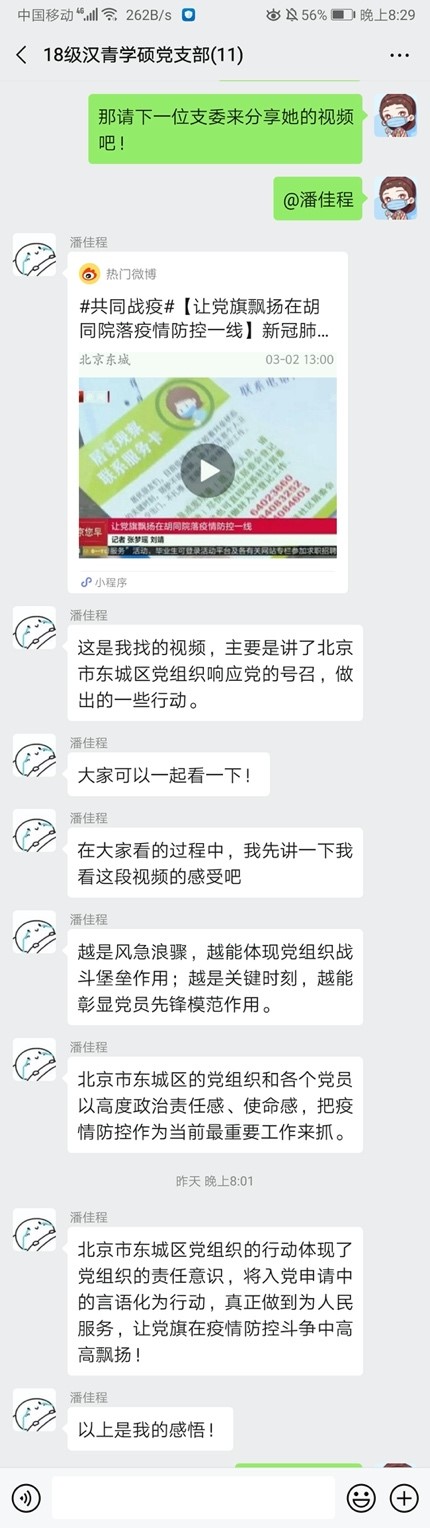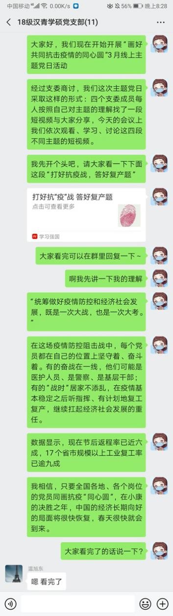 线上主题党日|2018级汉青学硕党支部分享讨论主题短视频,讲抗疫故事凝抗疫力量