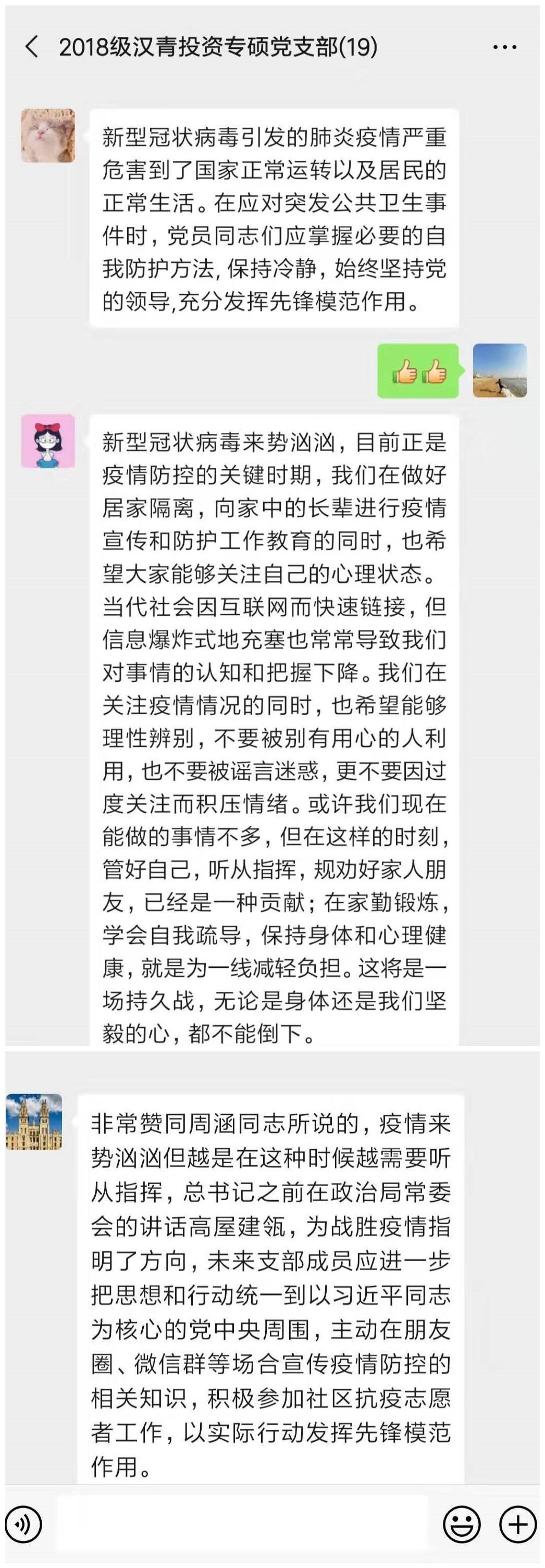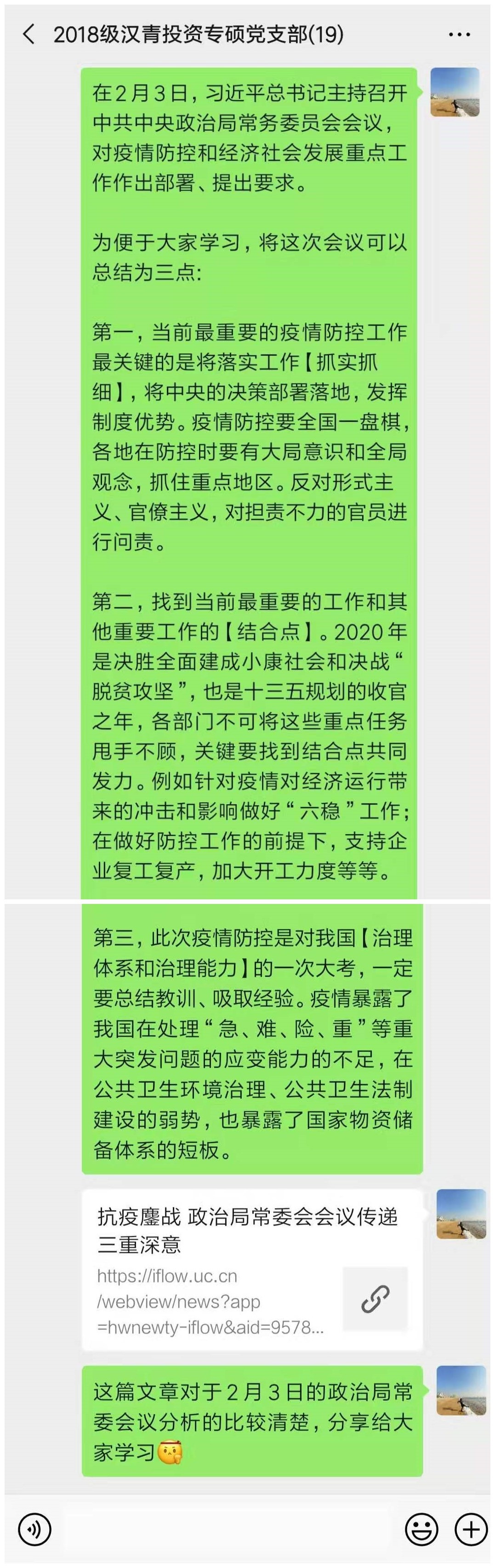 为更好地学习疫情防控相关知识,切实动员广大党员在疫情防控阻击战中争先锋做表率,2020年2月5日上午2018级汉青投资专硕党支部在线上召开了“抗击疫情,党员先行”主题党日活动。本次会议由党支书马申娟同志主持,18名党员同志参加。