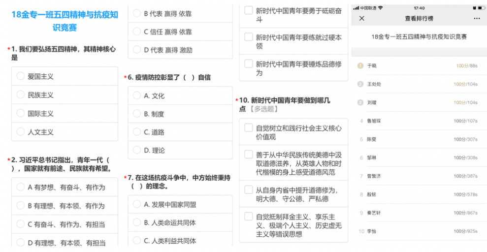 本次活动共分为三个环节:一是观看回顾习近平总书记五四讲话,让党支部成员重温五四精神要领。二是支委解读线上学习材料“习近平总书记五四对青年的问候”。三是举办线上五四精神与抗疫知识竞赛,其中有近一半的支部党员获得了满分的好成绩。
