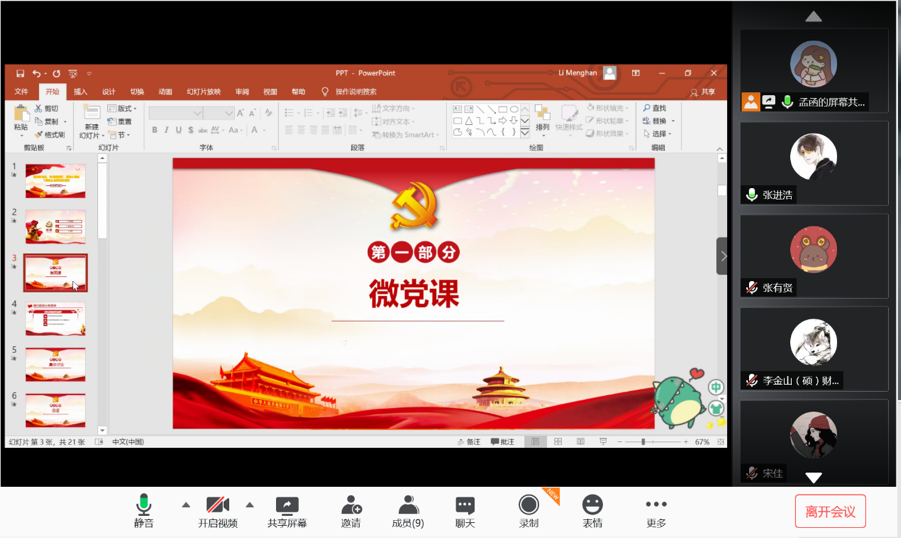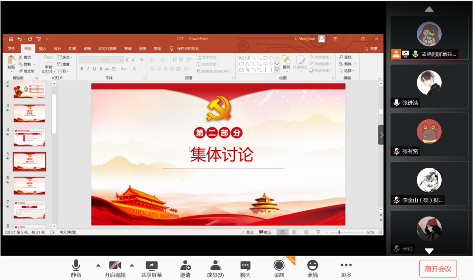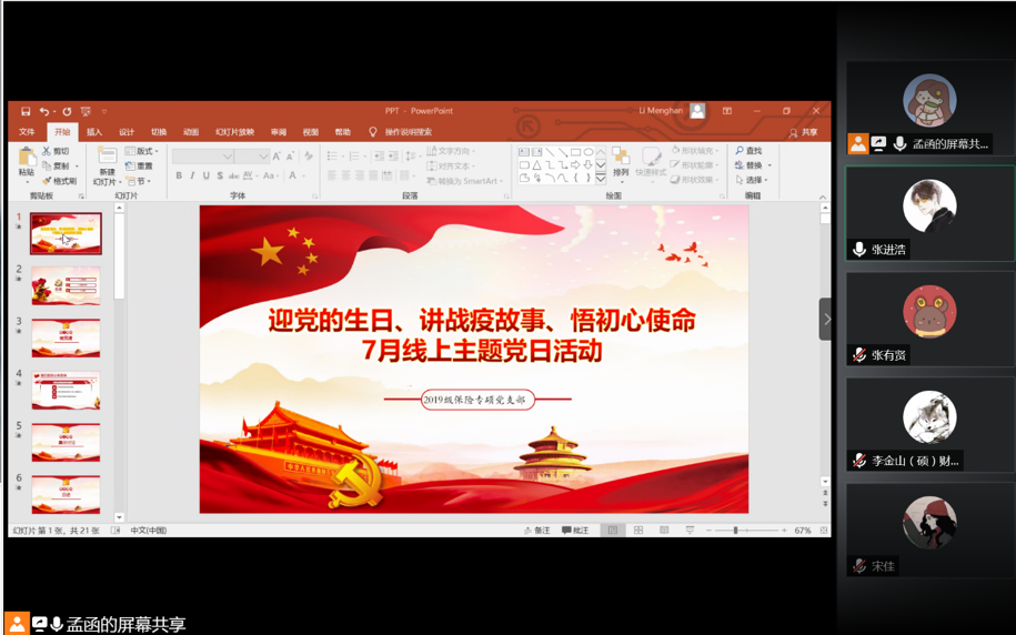 7月10日晚8点,2019级保险专硕党支部通过腾讯会议平台顺利开展了以“在疫情防控斗争中践行初心使命”为主题的微党课以及7月主题党日活动。全体党员和积极分子参与学习并进行了积极讨论。本次活动的流程为党支部书记李梦菡为大家讲授专题微党课,之后全体成员认真观看学习了由孙华玲老师讲授的大白预测 党委战“疫”微党课,最后大家分享了自己的学习心得体会并讲述了身边的抗疫故事。