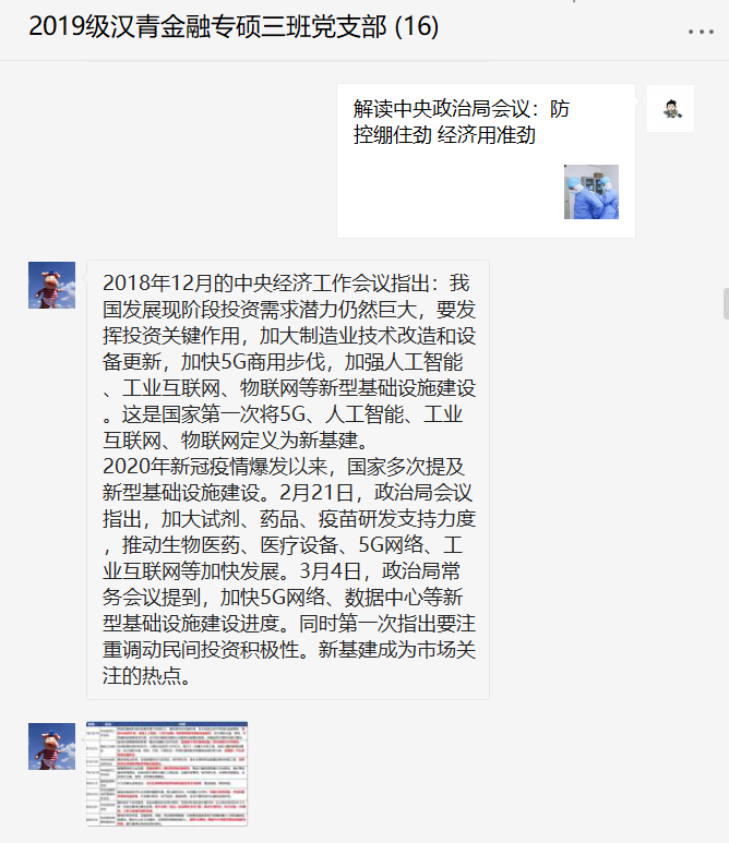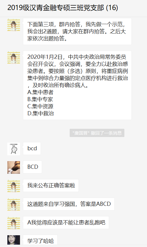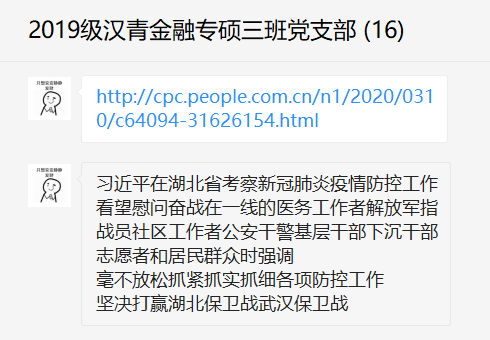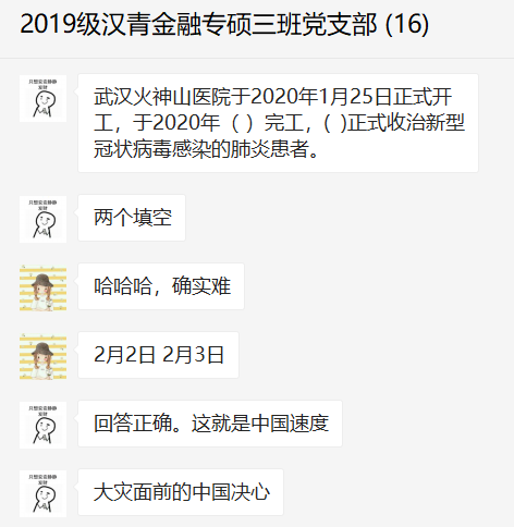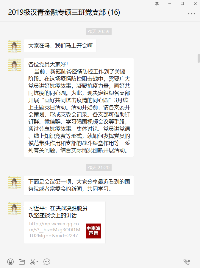 2020年3月10日晚,2019级汉青金融专硕三班党支部响应大白预测 党委号召,在支部微信群组织召开了“画好共同抗击疫情的同心圆”线上主题党日活动。本次线上会议由陈嘉欣书记主持,全体党支部同志积极参与。