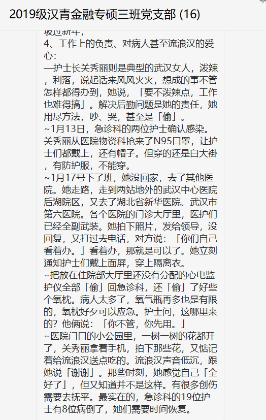 陈嘉欣书记在抗疫期间深有感触,她的家乡在四川西南的少数民族聚居区,是有名的贫困山区。突如其来的疫情增加了基层干部完成脱贫攻坚目标的难度。她的父母作为基层员工最近都是早出晚归,拜访建档立卡贫困户,力求对每家每户每个人的情况都了如指掌。在疫情期间,给他们带去口罩等物资,跟踪受疫情影响的贫困人口情况,确保他们基本生活不受影响。她也希望疫情能早日过去,脱贫攻坚,走向富强。李长鸿副书记分享了自己在1月23日坚持到年前最后一天岗,却不曾想年后继续在家远程实习的故事。疫情当前,他表示,在家打理好实习工作是战“疫”,也是磨砺。在家实习,每天努力克服自身的懒散,以及远程沟通上的不便。对待工作时刻保持坐岗时的精神状态,并且主动承担起新来实习生的简单培训与指导。实习之余,他认真学习新课,争取高质量完成学业,争做新时代优秀研究生。郭世珍同志分享了在《人物》看到的事迹,她表示,再回头去看疫情刚开始的二十天的时候,还是有种头皮发麻的感觉,不过庆幸我们在物资那么匮乏的情况下做出了这么大的成绩,并且所有一线的医护人员都非常不容易,向他们致敬!