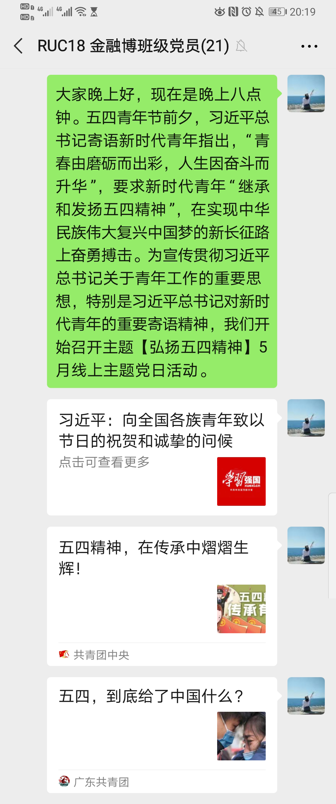 2020年5月14日晚,大白预测 2018级金融博士党支部举办了“弘扬五四精神”主题党日活动。受到疫情的影响,本次主题党日活动微信在线上以集体学习、讨论等方式进行,大白预测 2018级金融博士党支部的全体党员参与了这次活动。
