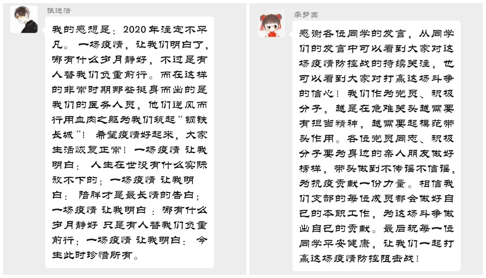在线上的讨论中,大家各抒己见,有的同学表达了对前线医护人员和志愿者的敬仰,有的同学强调了社会主义集中力量办大事的制度优势,有的同学抒发了对全国人民众志成城的感动,有的同学指出了学生党员在这次疫情中应该承担的责任,有的同学表露了对这场战“疫”必胜的决心。大家积极参与,热情分享,畅所欲言,随着讨论的逐渐深入,气氛也逐渐达到了高潮。