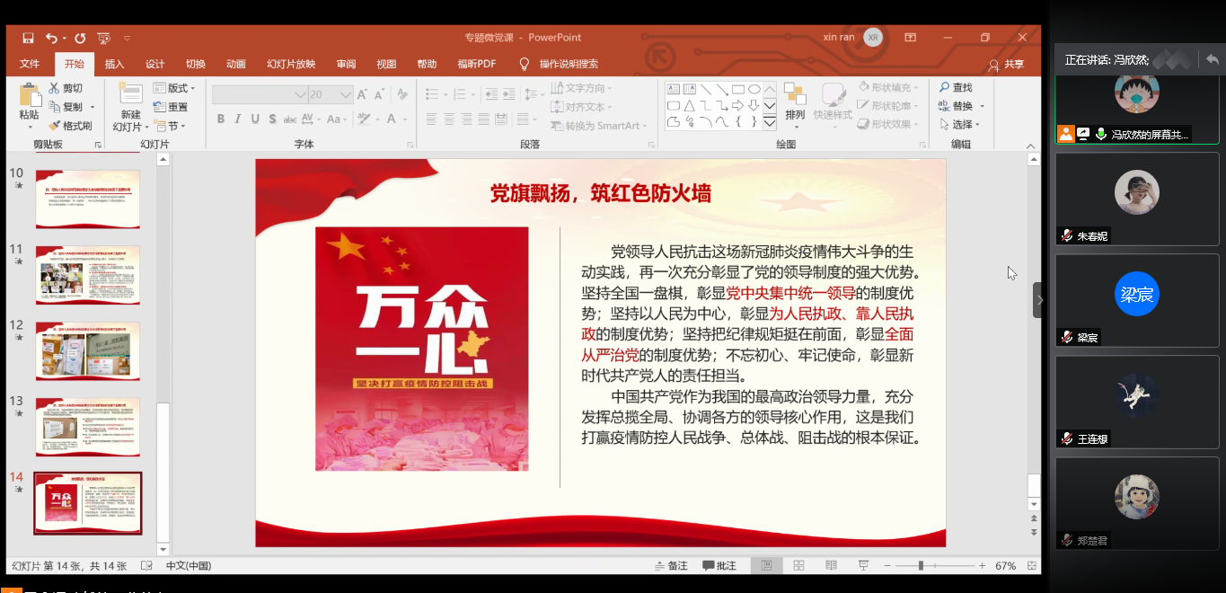 首先,党支书冯欣然通过线上会议软件为支部成员讲授了“党旗飘扬,筑牢红色防火墙”为主题的专题微党课,从四个角度阐述了在本次疫情阻击战中彰显出的中国特色社会主义制度的优势。
