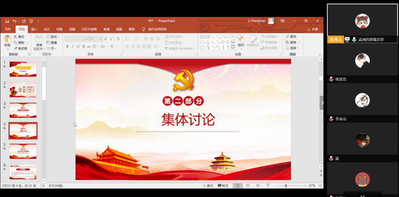 5月13日晚8点,2019级保险专硕党支部顺利开展“弘扬五四精神、凝聚青春力量”5月线上主题党日活动。本次会议由党支部书记李梦菡同志主持,全体党员和积极分子参会。