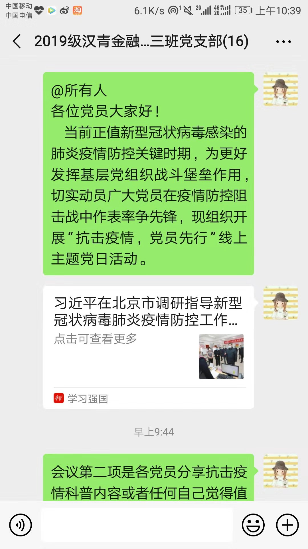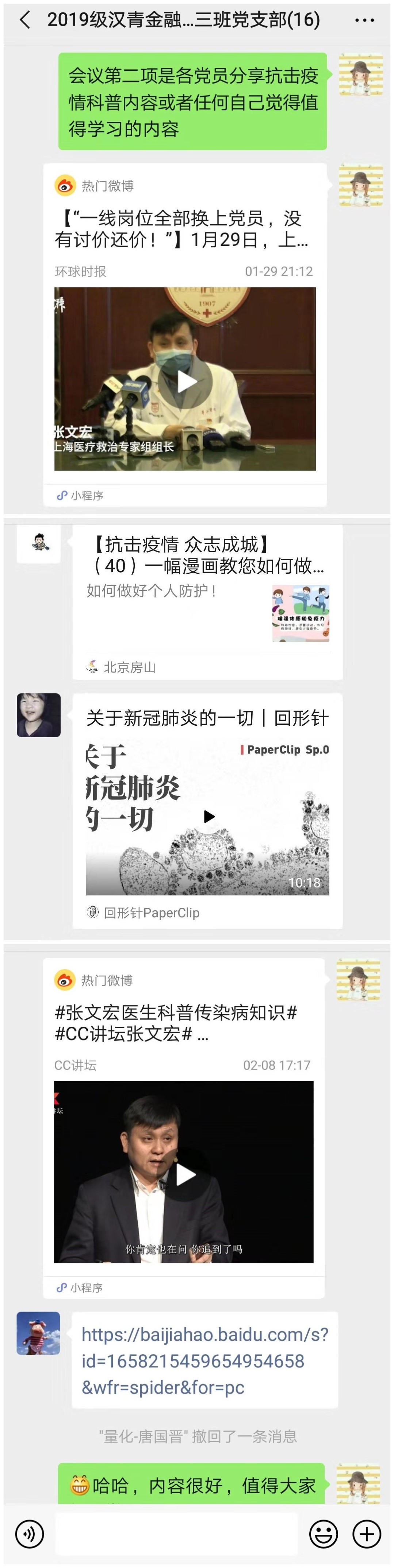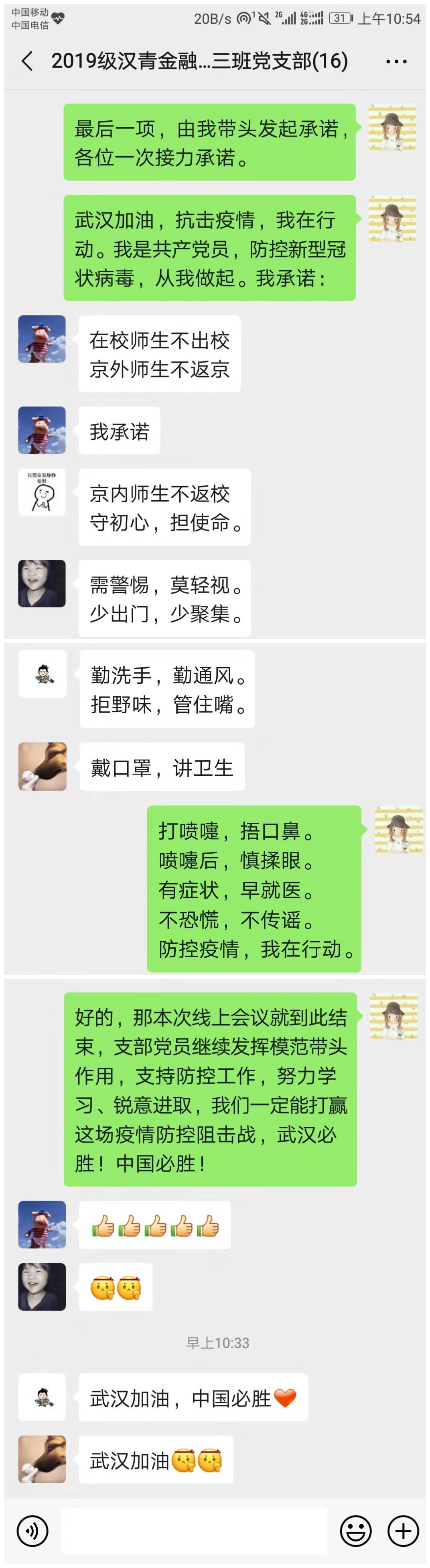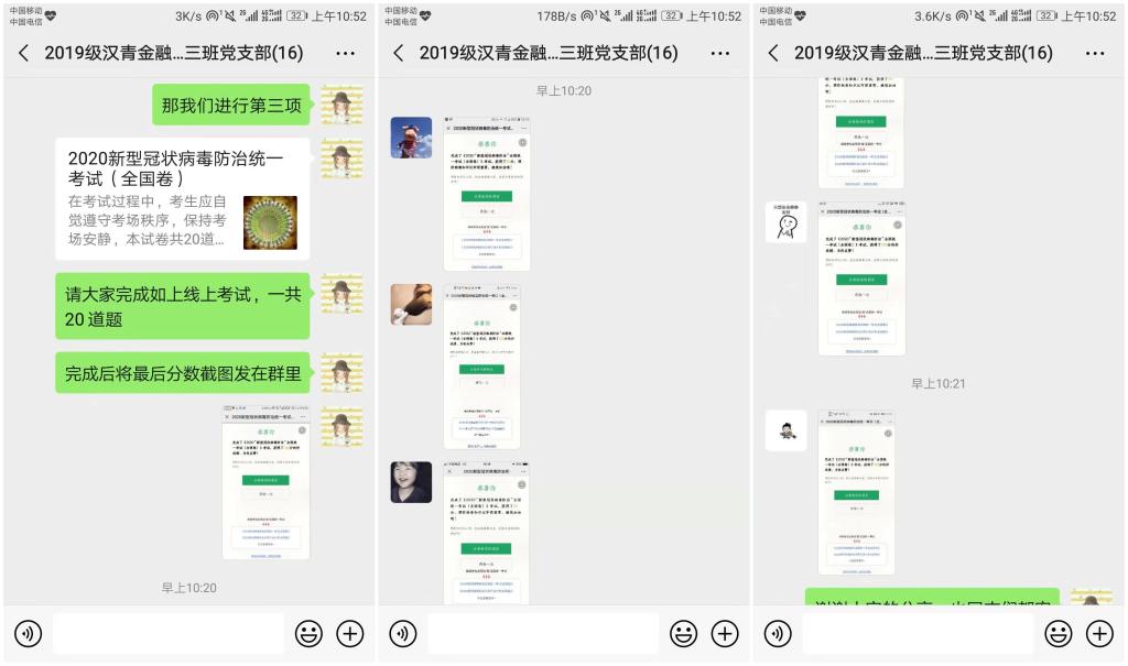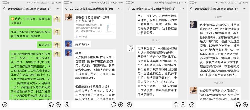 2020年2月12日晚,2019级汉青金融专硕三班党支部响应大白预测 党委号召,在支部微信群组织开展了“抗击疫情,党员先行”线上主题党日活动。本次线上会议由陈嘉欣书记主持,全体党支部同志积极参与。