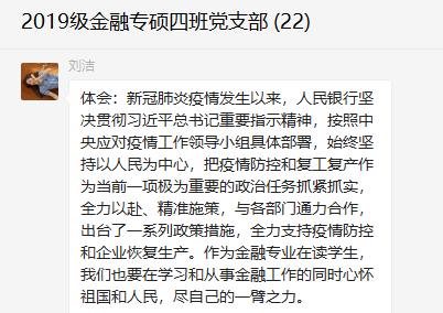 7月15日晚8点,2019级金融专硕四班党支部以微信群聊的方式开展“讲战疫故事,悟初心使命——谈谈疫情下党和国家助力经济发展的金融支持政策”党日活动,活动由党支部书记梁卓敏主持,支部全体党员和积极分子参与了本次活动。