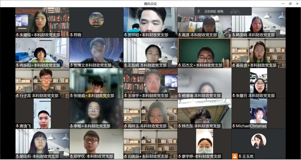 2022年5月6日,贾俊雪副院长通过腾讯会议平台为本科财政党支部、2020级税务专硕一班党支部与2020级税务专硕二班党支部宣讲习近平总书记在中国人民大学考察时的重要讲话精神。