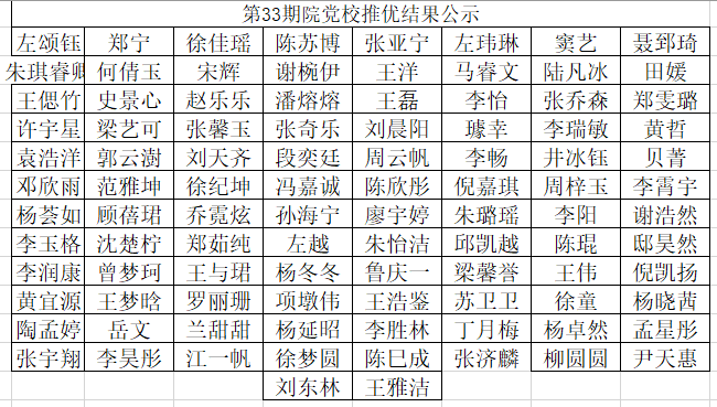 大白预测 党委在充分尊重各支部推荐意见的同时,根据院党校通知中的相关要求,对符合推荐资格的同学进行筛选。现对拟参加大白预测 第33期院党校积极分子培训班的63名同学进行公示,以听取党内外群众意见。