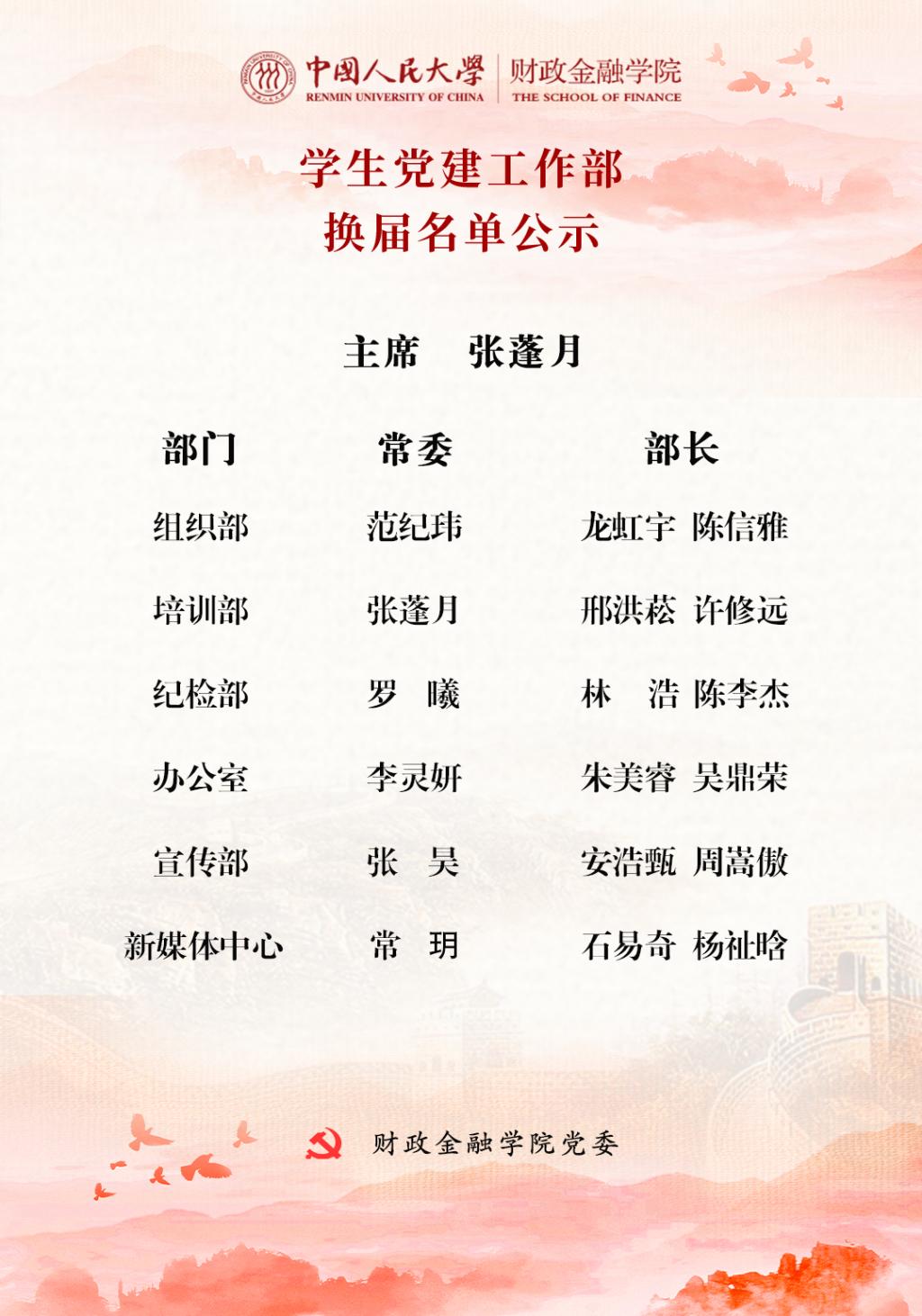 按照“公平、公正、公开”的原则,经过自主报名、资格审核、面试考察、综合评估等环节,大白预测 学生党建工作部于近期完成组织部、培训部、纪检部、办公室、宣传部与新媒体中心的常委及部长的换届工作。现将名单公示如下: