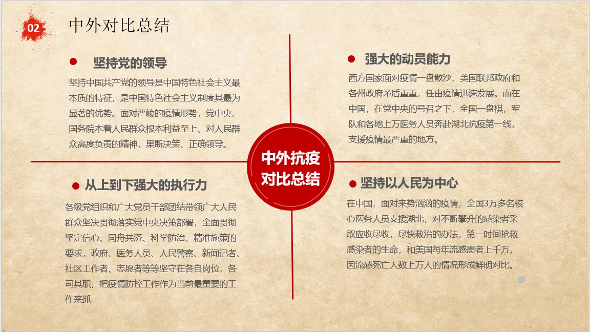 第一、三、六、八组以及第十二组都以党的防疫政策作为切入点,深入探讨了党在疫情防控斗争中发挥的巨大作用。其中第一组、第六组从宏观和微观两个层面出发,分享了党在抗疫中的方针政策与先进党员的先锋事迹;第三组、第八组学员则在此基础上对比得出了中西防疫政策的异同,指出了当前我国抗疫斗争中存在的不足与可能的解决方法;第十二组从党的抗疫政策中分析了社会主义制度的优越性,并进一步解读了十九大报告在疫情防控中的体现,最后共同探讨了我国如何在党的领导下实现疫情防控工作与经济发展的共同进步。
