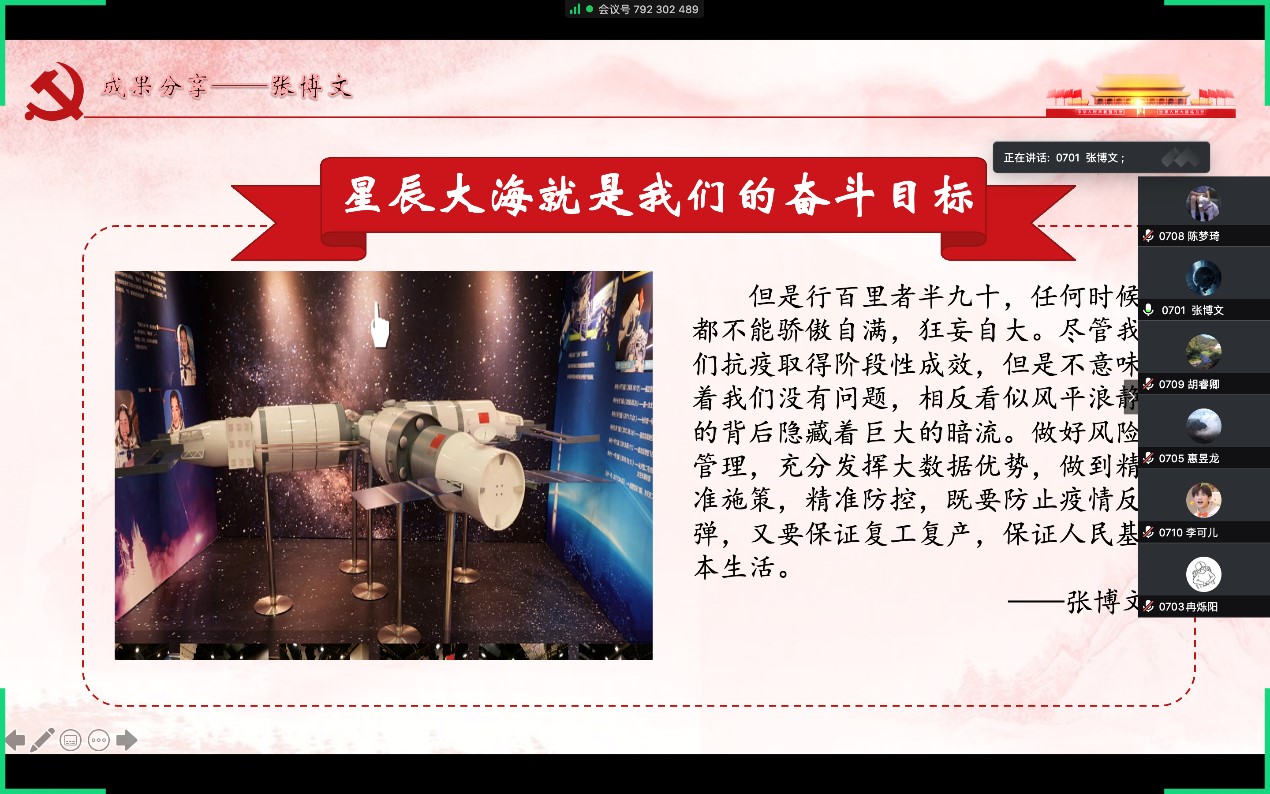 第二组、第四组与第九组针对线上参观与线上党课的学习成果进行了讨论展示。第二组选取了中国国家博物馆、中共一大会址纪念馆与中国人民抗日战争纪念馆进行了线上参观,并结合当前疫情防控形势分享了参观感悟。第四组学员共同观看了《辉煌中国》纪录片的线上党课,探讨了中国先前取得的辉煌成就是当前良好的抗疫形势实现的基础。第九组则从“中国梦”这一主题出发,探讨了中国梦的历史文化渊源以及在新冠疫情下的当代价值。