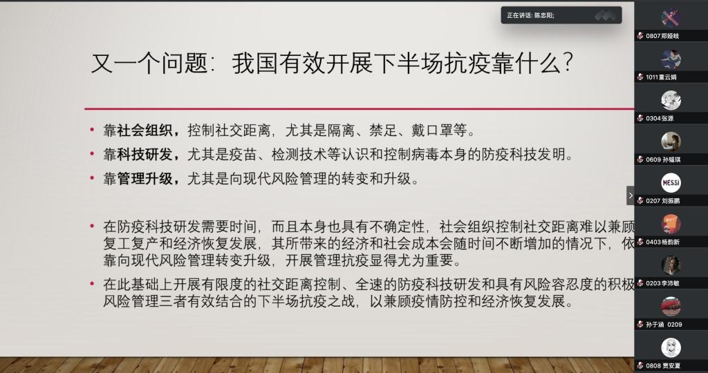 随后,陈忠阳教授围绕“我国有效开展下半场抗疫靠什么”这一问题给出了一些建议,并针对社会组织、科技研发与管理升级这三个方法引导学员进行了思考。