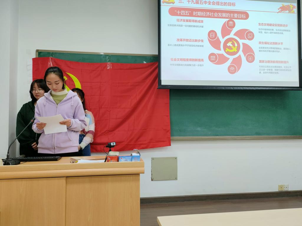 李文娟同志和姚楠同志讲解了十九届五中全会公报,分别从全会出席情况、基本事项、决胜全面建成小康社会取得的10方面决定性成就、我国发展环境面临的深刻复杂变化、到2035年要实现的9方面远景目标、“十四五”时期经济社会发展的6方面主要目标、实现奋斗目标的12方面具体举措等方面进行讲述,详略得当,通俗易懂,支部成员收获颇丰。