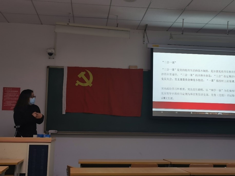 首先,党支书邓晴元同志向与会党员和预备党员介绍了《中国共产党支部工作条例》的重点内容,包括了党的组织设置、基本任务和工作机制。其中,党支书着重介绍了党的“三会一课”制度。“三会一课”是党的组织生活的基本制度,是加强党员日常教育管理监督的主要途径。“三会一课”的具体内容是:“三会”指定期召开党员大会、党支部委员会和党小组会,“一课”指按时上好党课。特别地,党支书强调我校仅举行党员大会和党支部委员会。此外,党支书还带领党员和预备党员们了解了党的其他组织生活形式,比如每月一次的主题党日活动、每年一次的组织生活会以及民主评议会等。