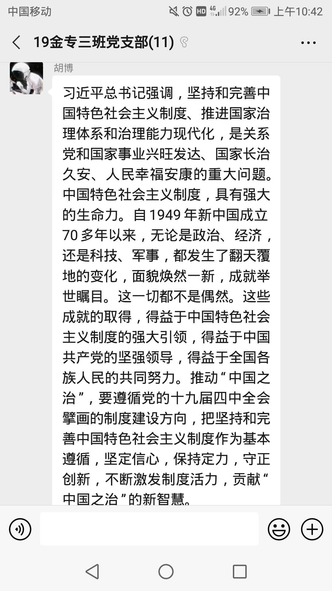 会议开始,9名党员同志将自己对于《习近平谈治国理政第三卷》的学习心得发到支部群内,互相交流学习。《习近平谈治国理政第三卷》共有十九个章节,9名党员同志分别就“决战脱贫攻坚”、“坚持以人民为中心”、“铸就中华文化新辉煌”、“提高保障和改善民生水平”、“完善和发展我国国家制度和治理体系”、“推动共建‘一带一路’走深走实”、“谱写新时代中国特色社会主义新篇章”、“推动经济高质量发展”八个章节发表了自己的学习体会。在对以上章节的交流讨论中,同学们既提到了与相关专题相关的理论知识,也提到了党和国家在这些方面所做的实事,无论是脱贫攻坚,还是改善民生,党和国家始终将人民放在第一位,坚持发展为了人民、发展依靠人民。