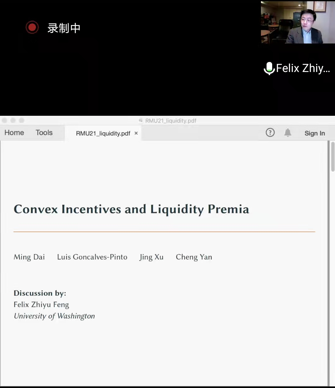 最后,徐靖副教授就“Convex Incentives and Liquidity Premia”展开报告,徐教授表明投资者偏好的凸性可以放大交易成本对股票流动性溢价的影响,这一结果源自于为获得年终奖金而进行风险转移的基金经理的动态投资组合,较大的溢价主要补偿由于风险转移策略的次优实施而导致的较低奖金,使用主动管理型共同基金的数据为模型的新颖预测提供实证支持。华盛顿大学的冯知宇教授就论文的理论和模型设计提出了改进建议。